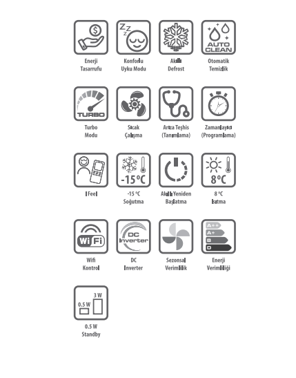 + Özel kumanda sensörü ile ayar sıcaklığını kullanıcının bulunduğu ortam sıcaklığına